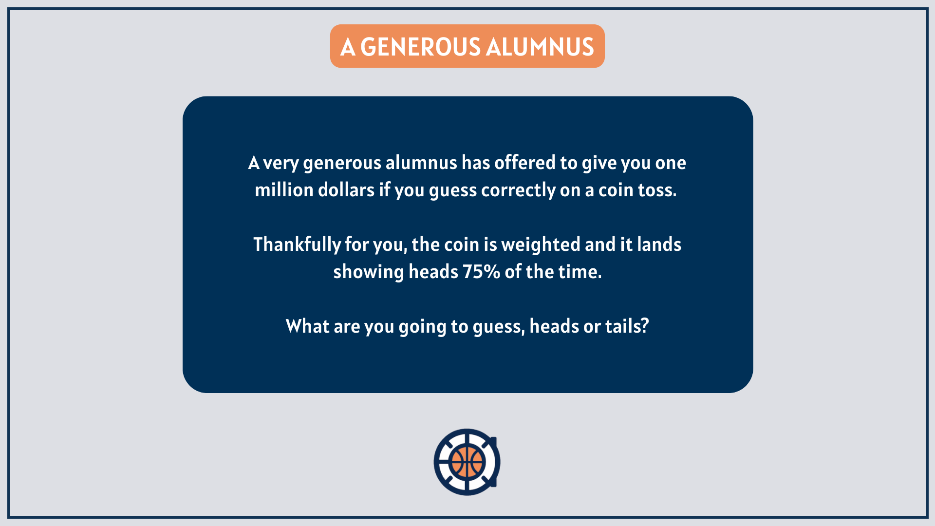 From that, we relate it to shot selection: the quality of the decision isn’t defined by the single outcome (just like choosing heads on a 75% coin is right even when it lands tails, a good shot is one we’d want again whether it goes in or not). On the other hand, guessing tails and getting tails isn’t a good decision: it’s a lucky result against the odds, just like a poor shot that goes in the basket.