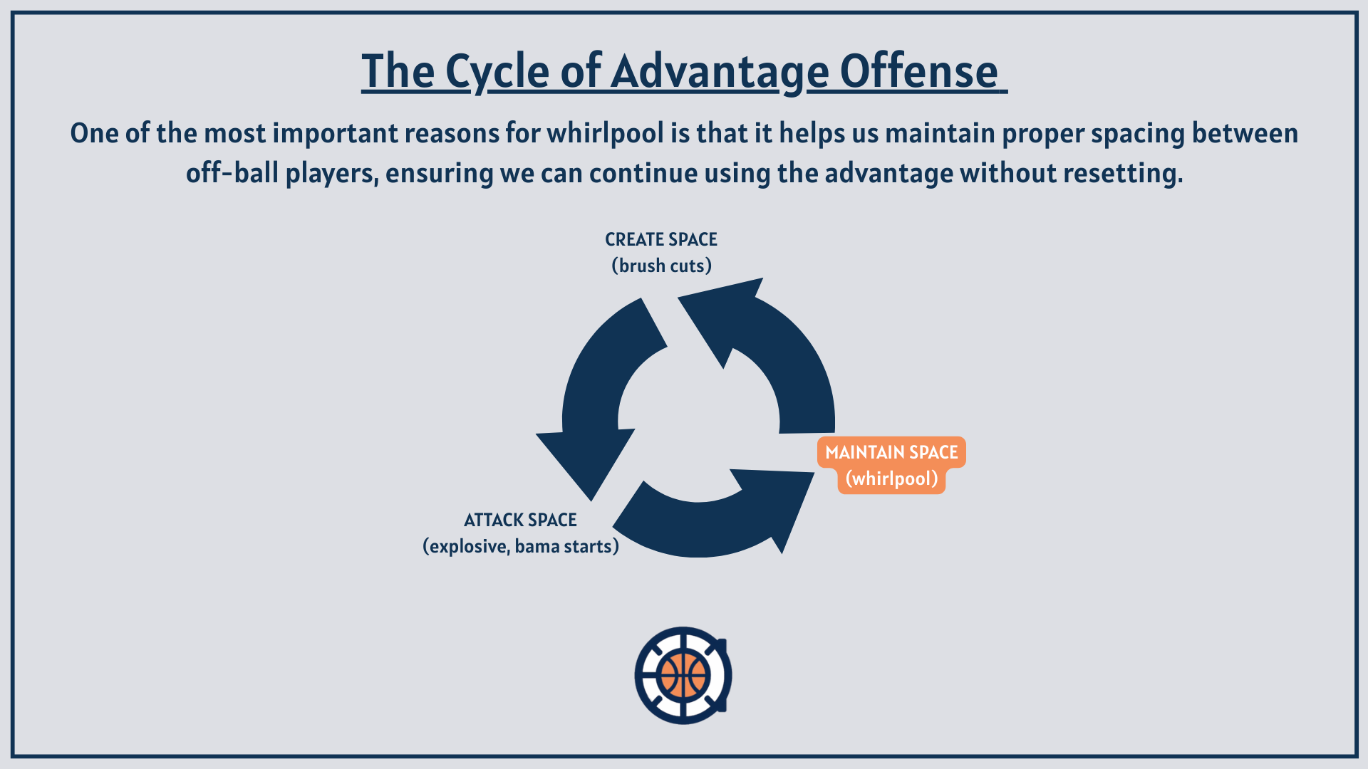 In this post, I am going to detail one of our halfcourt offense's most important concepts, one we call whirlpool (a type of movement I saw years ago in Rick Torbett's read and react offense).